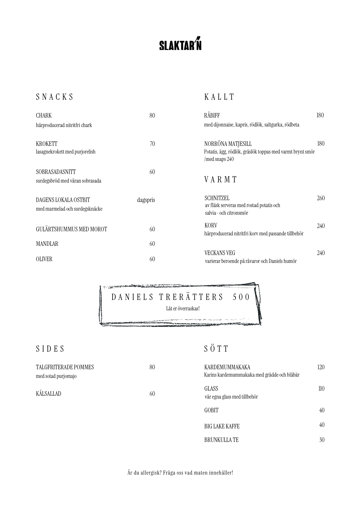 Boka bord? Såklart! Det gör du på knappen nedanför. Mejla info@slaktarn.nu om ni är fler än 6 pers som vill boka bord. Vill ni boka korvkurs med middag eller en catering? Då är det bara att mejla eran förfrågan också!